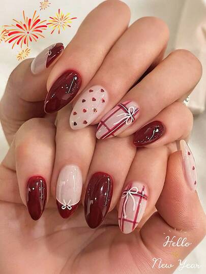 24個入り ミディアムアーモンド型 バレンタイン用 ネイルチップ ワインレッド ヒートボウ チェック柄フレンチネイル 新用 ヌード カラー フルカバー グロス仕上げ セットジェルのり1個とネイルファ