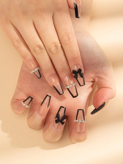 24ピース フレンチロングネイル(黒) 薔薇 の蝶結び飾り3D付き1枚のネイルファイル1シートのテープ付きプレスオンネイル ネイル用品を使ってルックをアップグレード 偽ネイル 偽爪 フェイクネイル