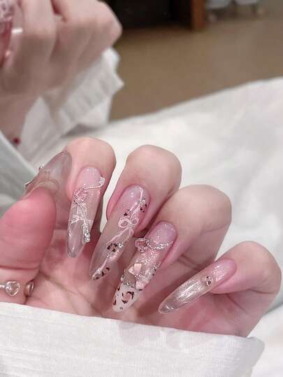 10個 Y2Kスタイル アーモンド型ピンクレオパード柄リボンネイルステッカー手描きハート装飾非対称ジェム手描きレオパード柄エンボスネイルピンクネイルキュートなネイルレオパード柄デザインヌ