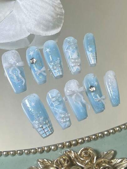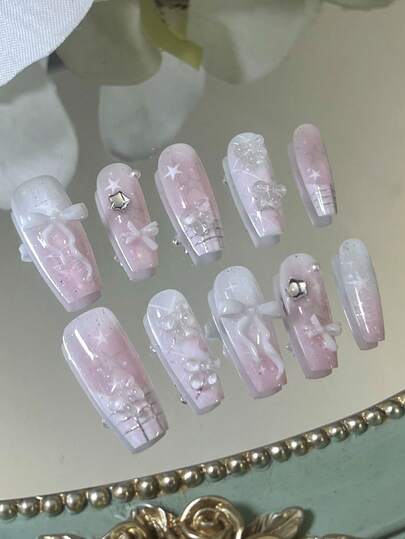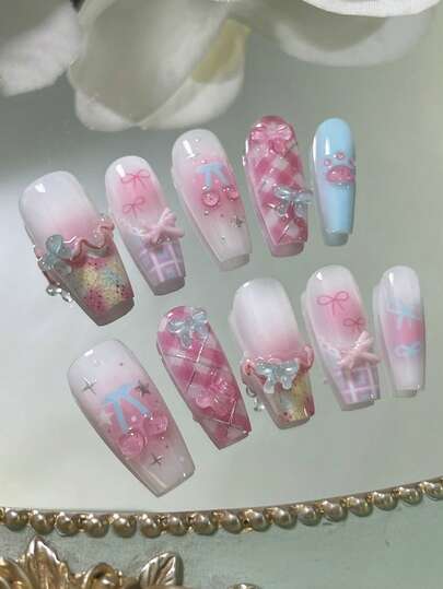 10個セット ハンドメイド かわいいスウィートなコフィンネイルステッカーY2Kグラデーションブラッシュベースにスターチェッカーボードドットマルチカラーダイヤモンドパターンネイルネイルサプライ