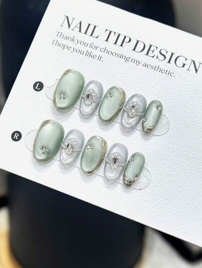 10個 手作り オーバル型 ショート ネイルチップエレガントなグリーンキャットアイミラーグラデーションカラー繊細な高級ネイルアートアクセサリー様々なシーンに適した女性用ネイルチップセット プレ