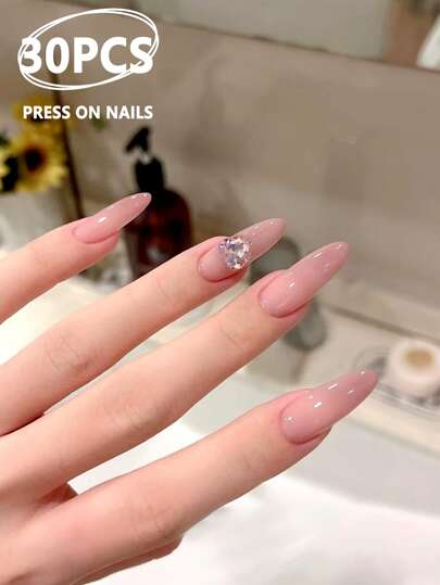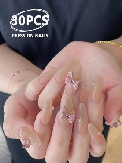 30個 長尖形ヌードピンク リボン ラインストーン ネイルアートステッカーファイルスティック1個ジェルパッド1個付き ネイルサプライ