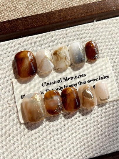 10個 手作り ウェアラブル ネイルアート フェイクネイル手描きピンクキャットアイオイルペインティング スクイーズ漫画 3Dマカロン 手描きグラフィティ 手作りネイルショートラダーネイルシェイプ