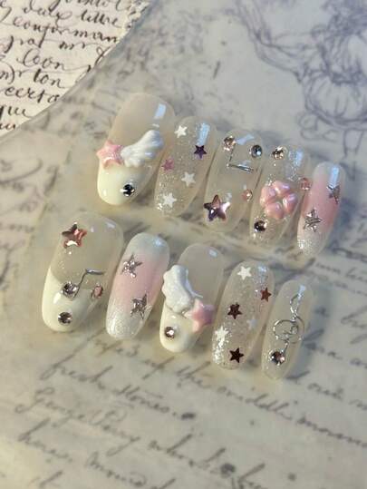 可愛らしく夢見心地のロリータ調エレガントなフレンチマニキュア10枚の中長楕円形ネイルシールピンクのグラデーションカラー一部のマニキュアはホワイトのフレンチスタイルを使用3Dの天使の羽星音