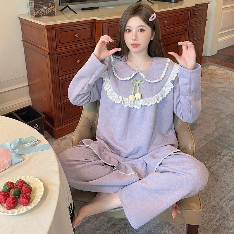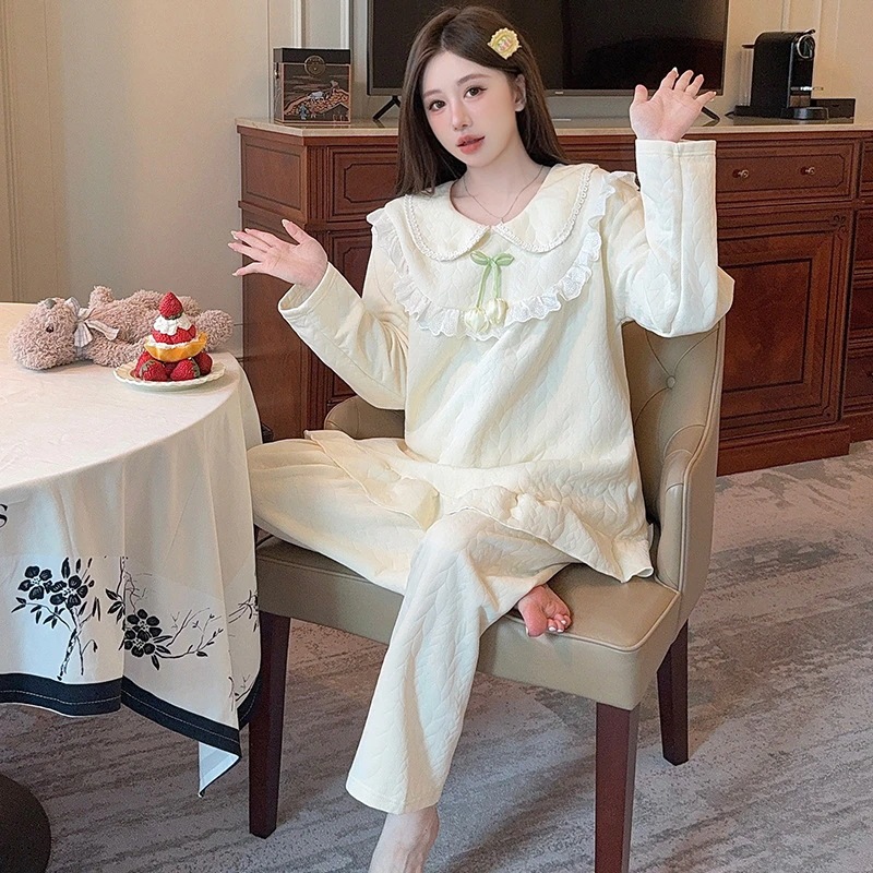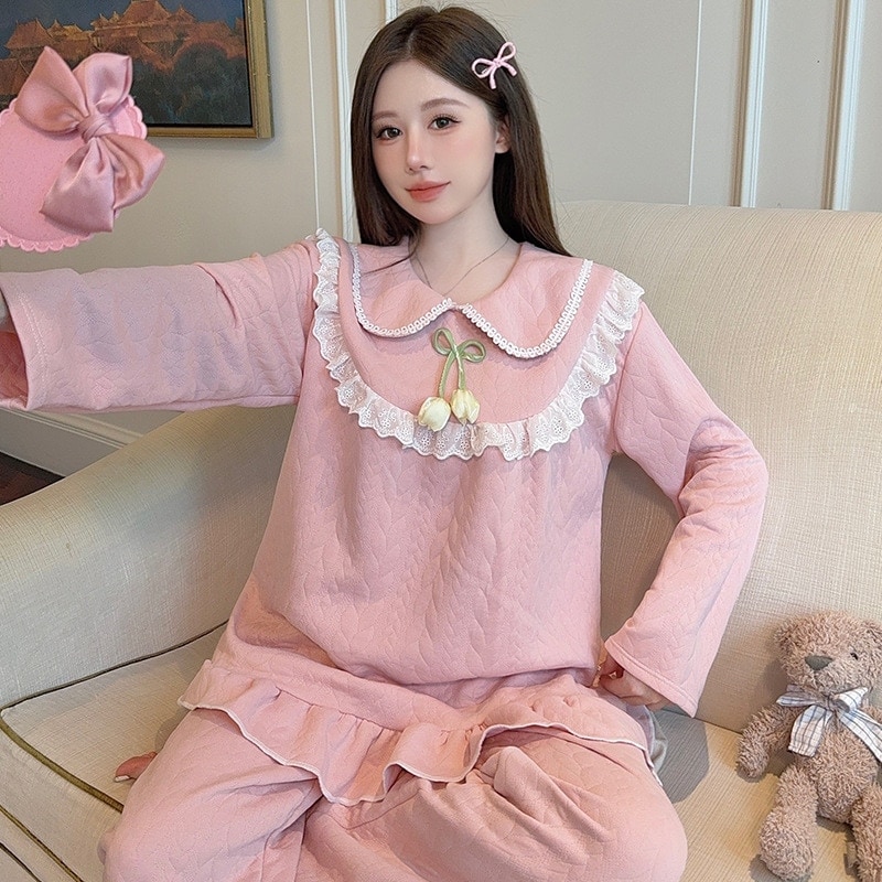 パジャマ レディース秋冬ボウタイカラー長袖甘めゆったり大サイズホームウェアセット