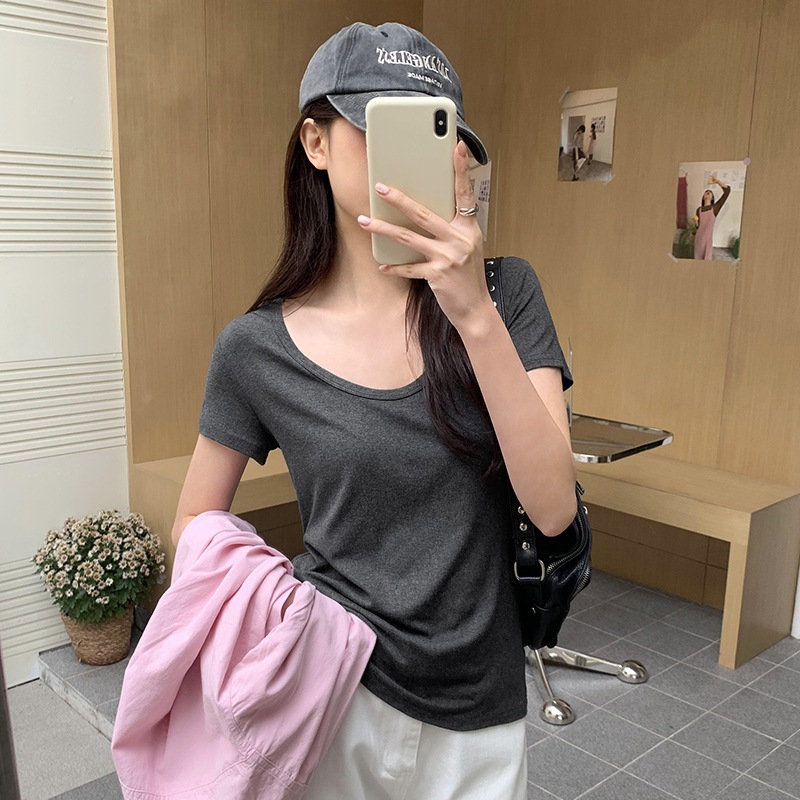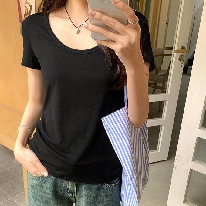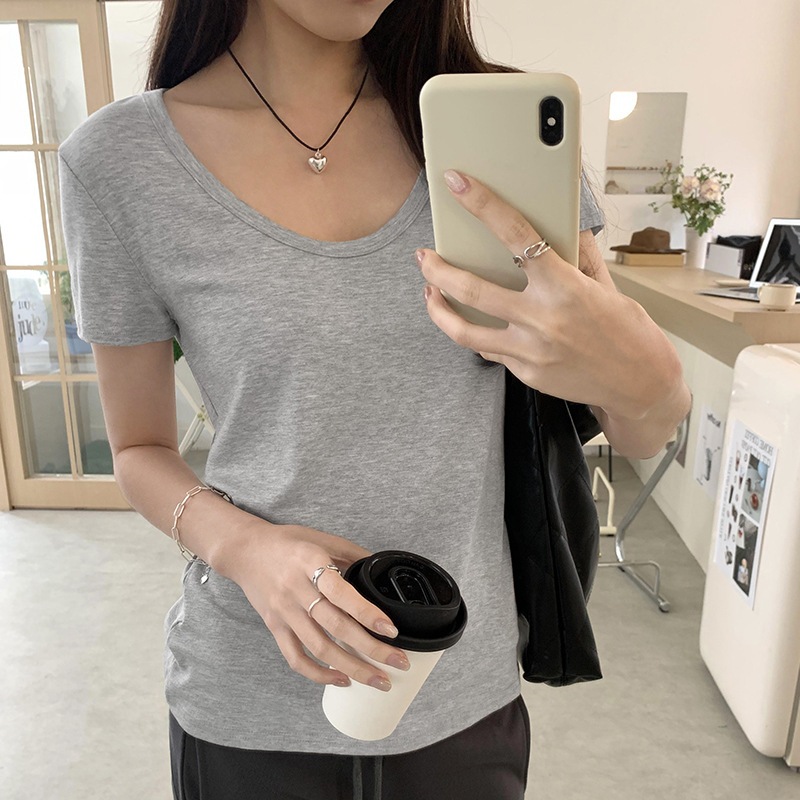 韓国風ベーシックなノーカラーユィー字ネックのストレッチ半袖Tシャツレディース夏新作こなれ感のある無地カジュアルトップス