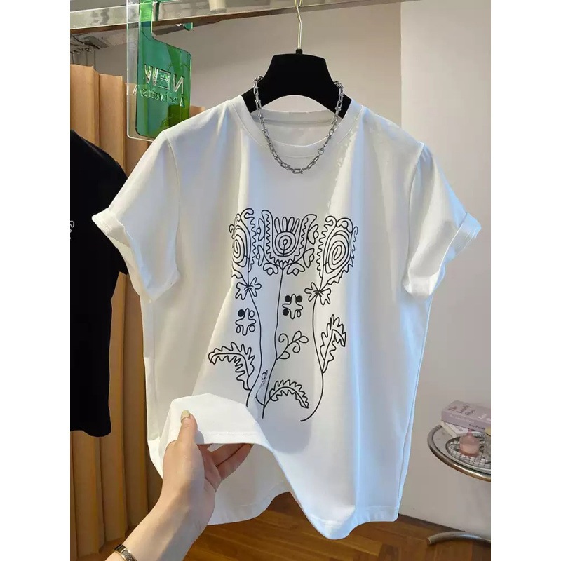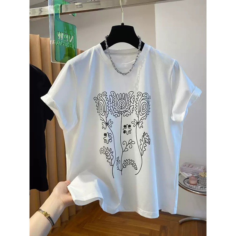 韓国風無地ラウンドネックプリント半袖Tシャツ女性夏新作高級感ふんわりオールマイティスリム見えトップストレンド