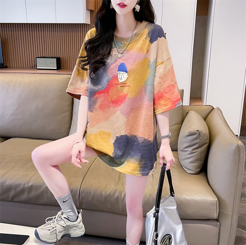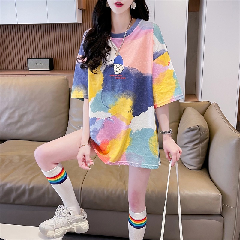 夏新作綿100% Tシャツ女性用ファッションカジュアル韓国風ふんわりシルエットデザイン性高いタイダイ染めカラフル半袖トップス