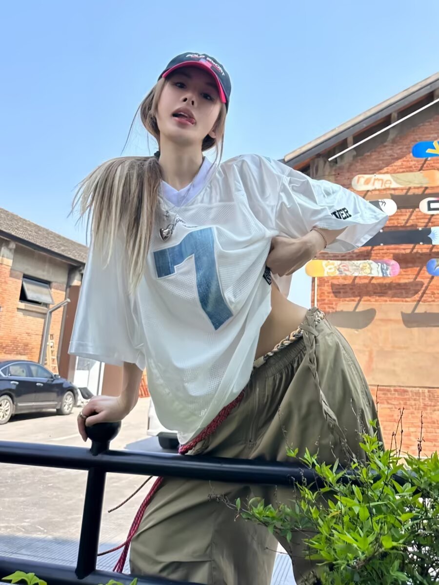 欧米韓流スイート&スパイシーなガールズサッカージャージー半袖レディースルーズフィットカジュアル通気性刺繍メッシュスポーツアメリカンヴィンテージTシャツ