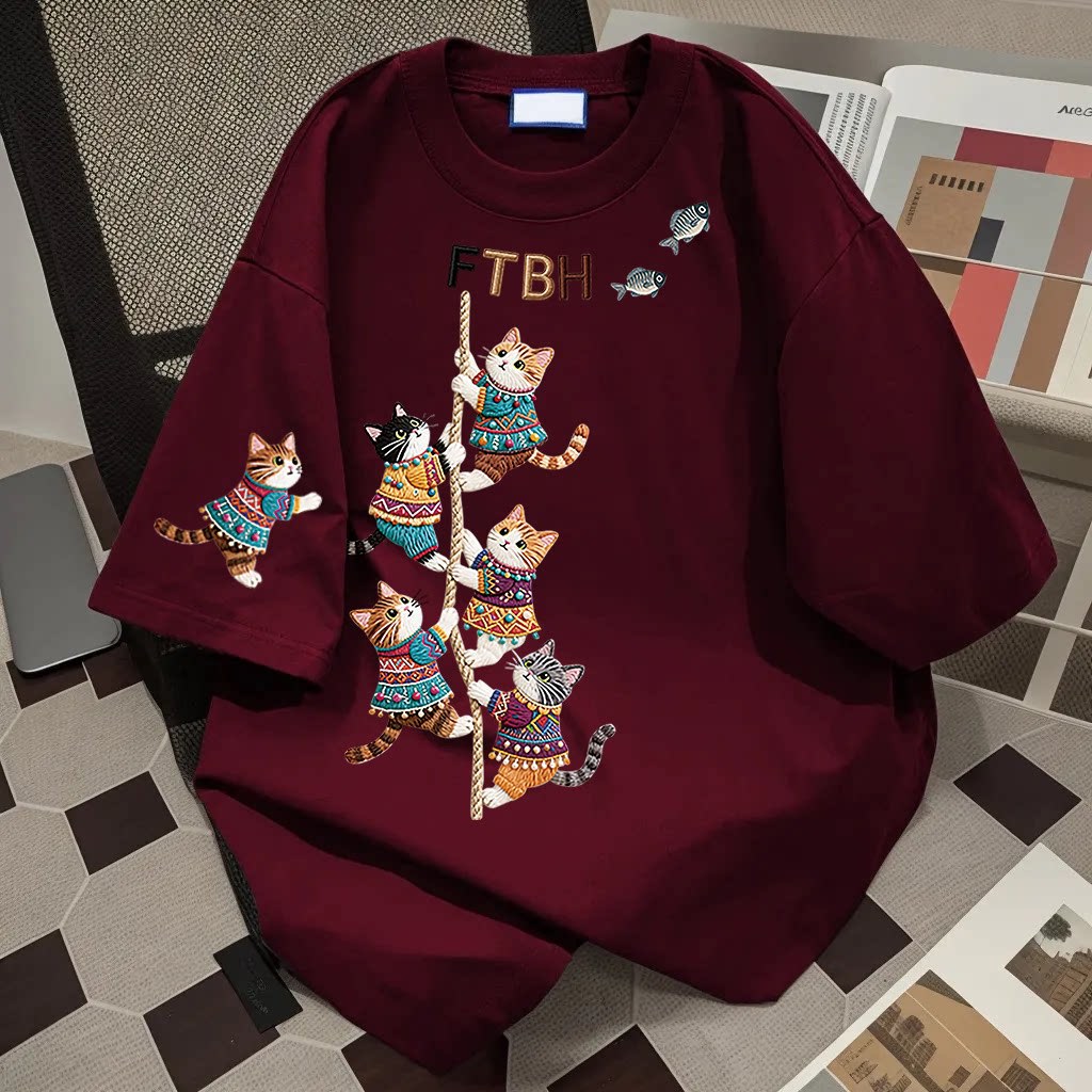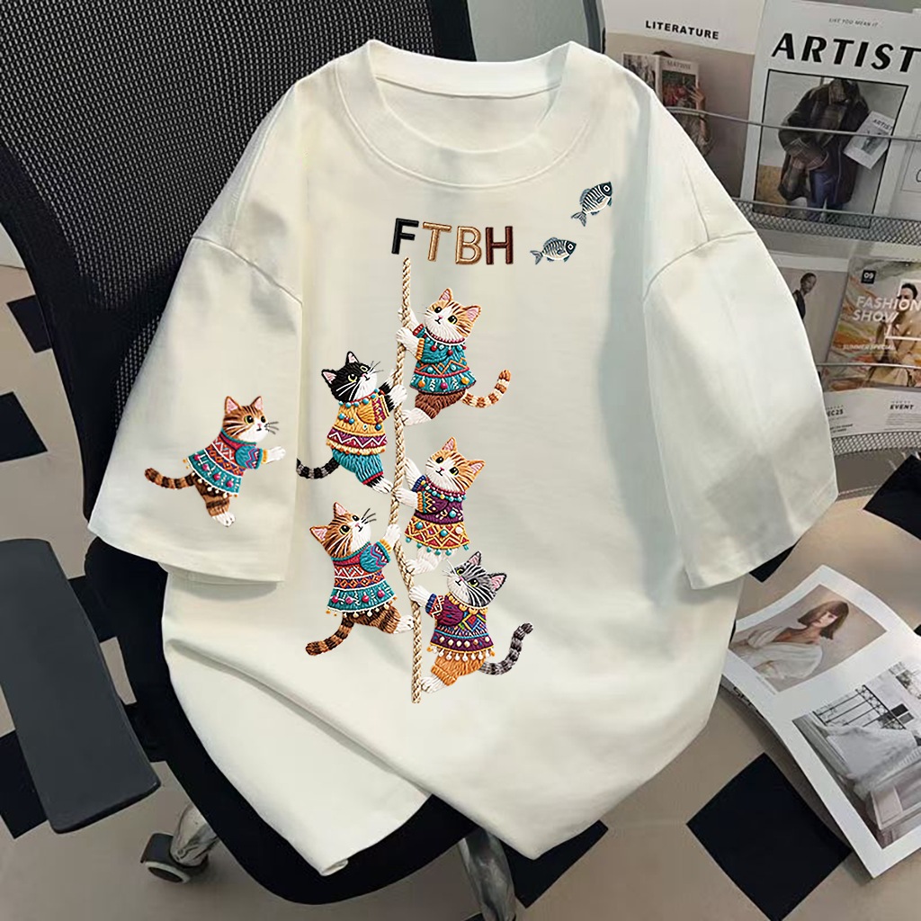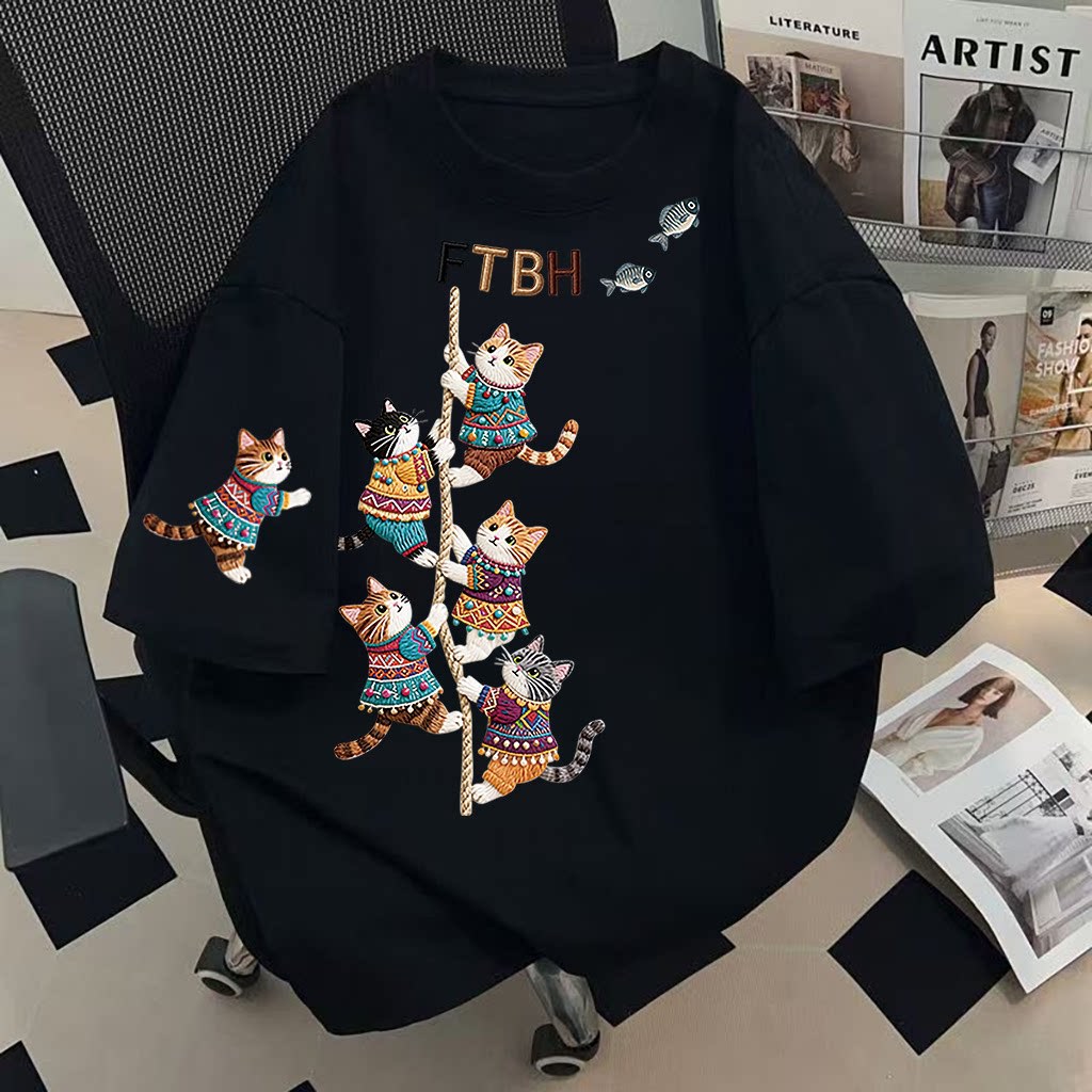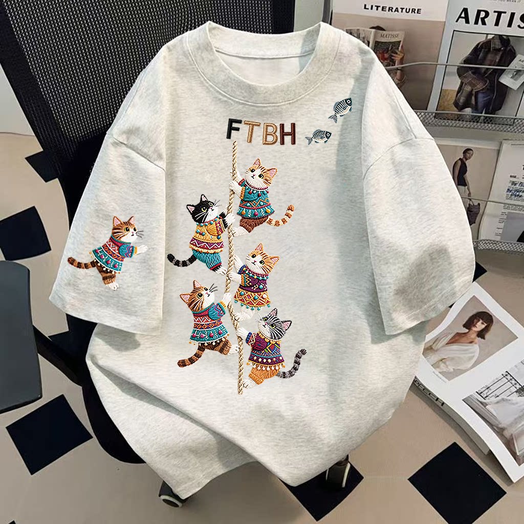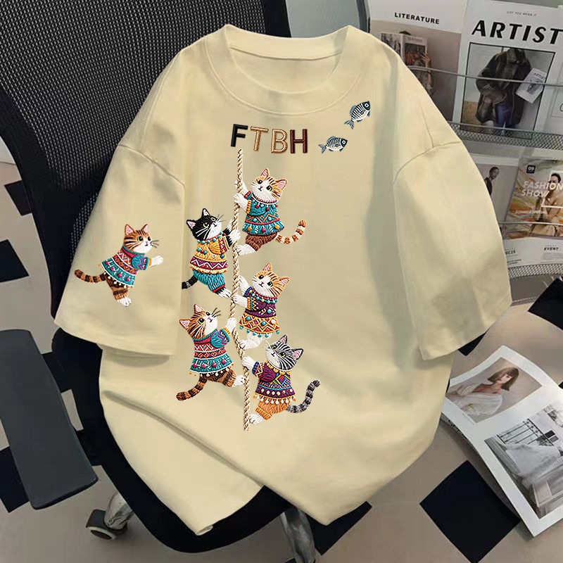 新作コットンロープネコプリントミディアム丈プリント半袖レディース夏ゆったり韓国風こなれ感トップス