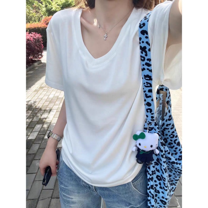 韓国風シンプルカジュアルVネックグレーゆったりシルエット半袖Tシャツ女性用夏新作ルーズフィットこなれ感万能ハーフスリーブトップス
