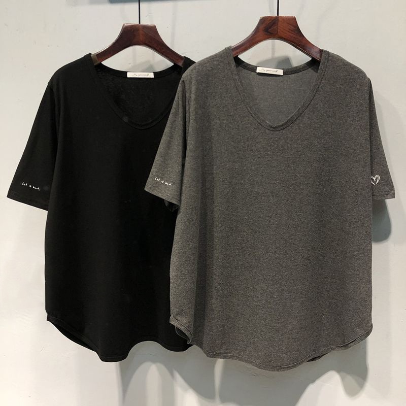 アメリカンスタイルルーズフィット大きいサイズVネック半袖Tシャツ女性用夏セーター韓国風ボトムスに最適プリント文字入り半袖トップス