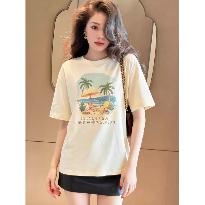 夏用コットン半袖Tシャツ女性韓国風ファッションブランドプリント万能ベースレイヤー女性用新作トップス