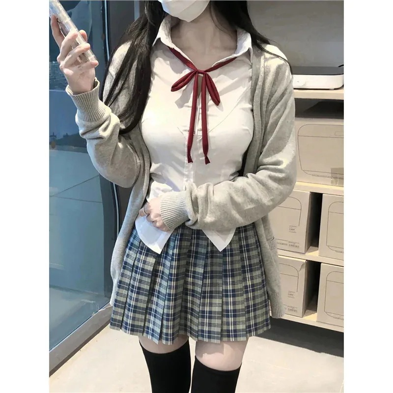 制服 セット コスプレ セット ニットカーディガン長袖ウエスト学院風ジャケット 風セーター女性用Vネックゆったりアウターセット 韓国ファッション