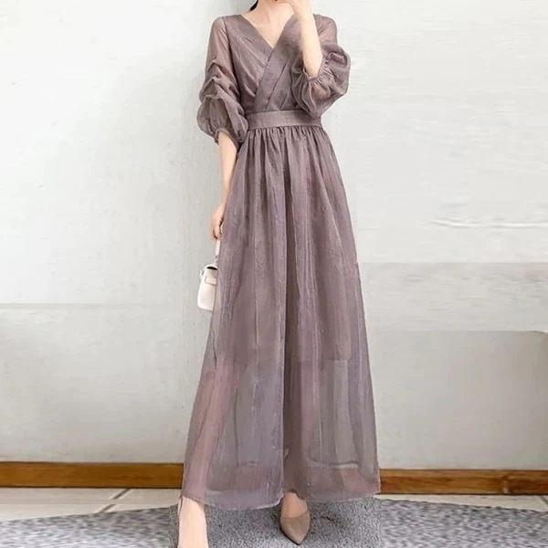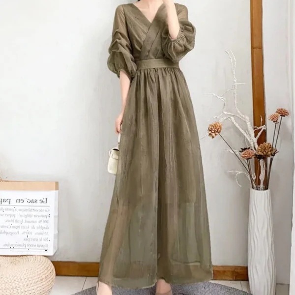 今らしいコーデ ランタンスリーブ ギャザー飾り Vネック エレガントワンピース