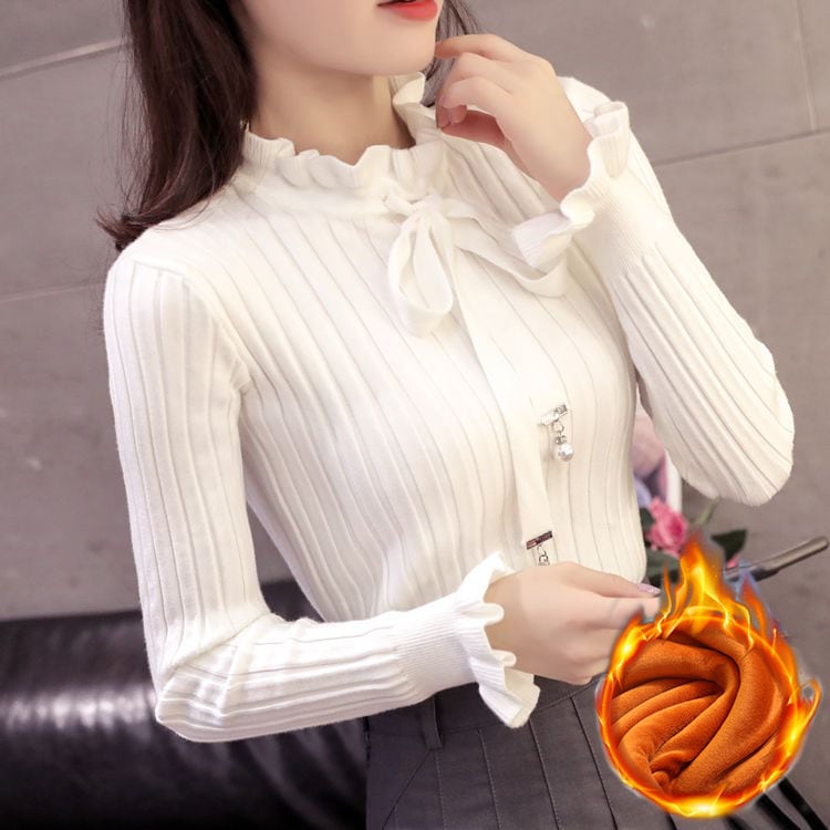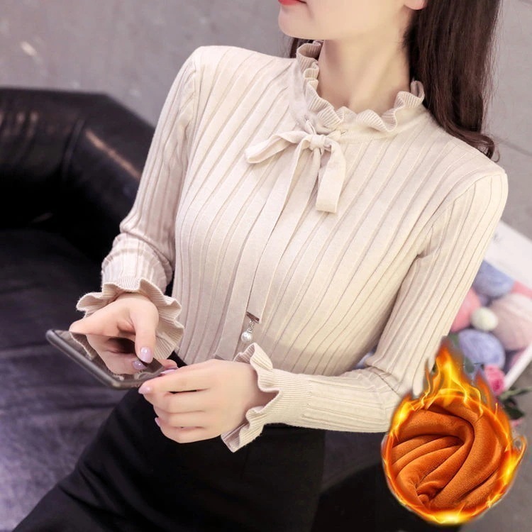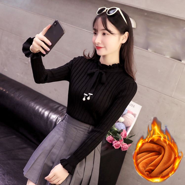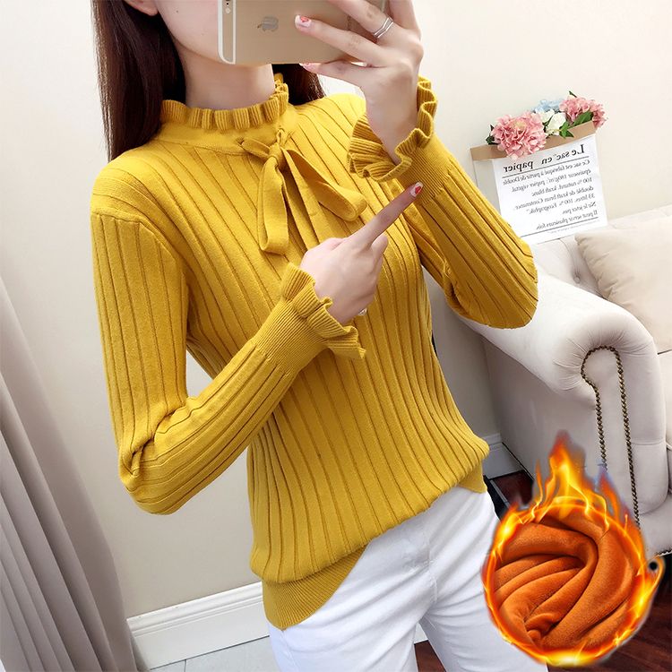 新作 裏起毛 セーター レディースニ リボン ニットインナー 韓国ファッション 長袖 修身 木耳縁 プルオーバー