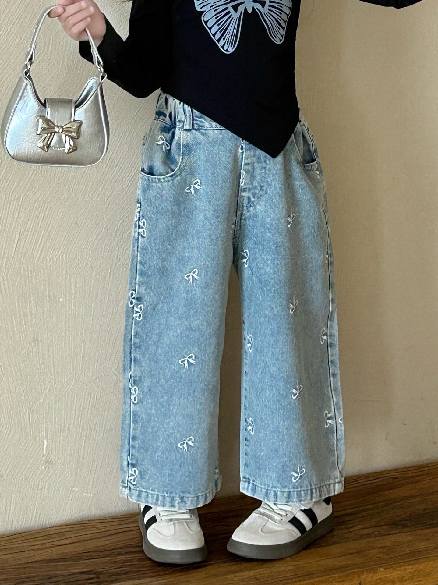 【即納】今買いたいが !レギンス デニム パンツ 春新しい女子刺繍弓ジーンズ子供ズボンカジュアルワイドパンツ パンツ 韓国風 子供服 2025春秋 大人気 新追加