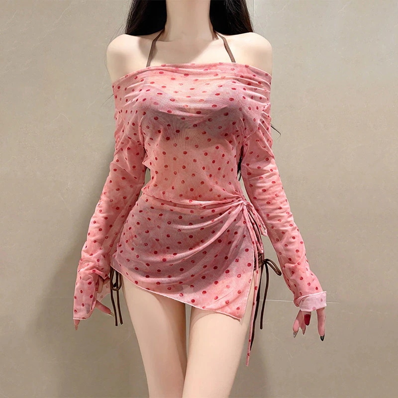 レディース水着 3点セット 長袖 ドット柄 ワイヤー入り スリム効果 ボディラインを美しく見せる 温泉用 プロ仕様の水着セット