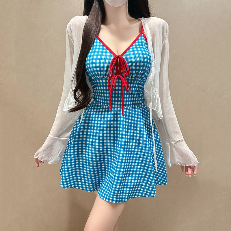 レディース プラスサイズ ワンピース 3点セット レトロチェック 長袖 オーバージャケット UVカット ぽっちゃり体型向け 体型カバー 温泉用