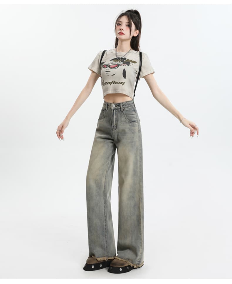 ヴィンテージデニム ワイドパンツ レディース 高ウエスト ストレートシルエット ウォッシュ加工 ほつれデザイン ワイドデニムパンツ