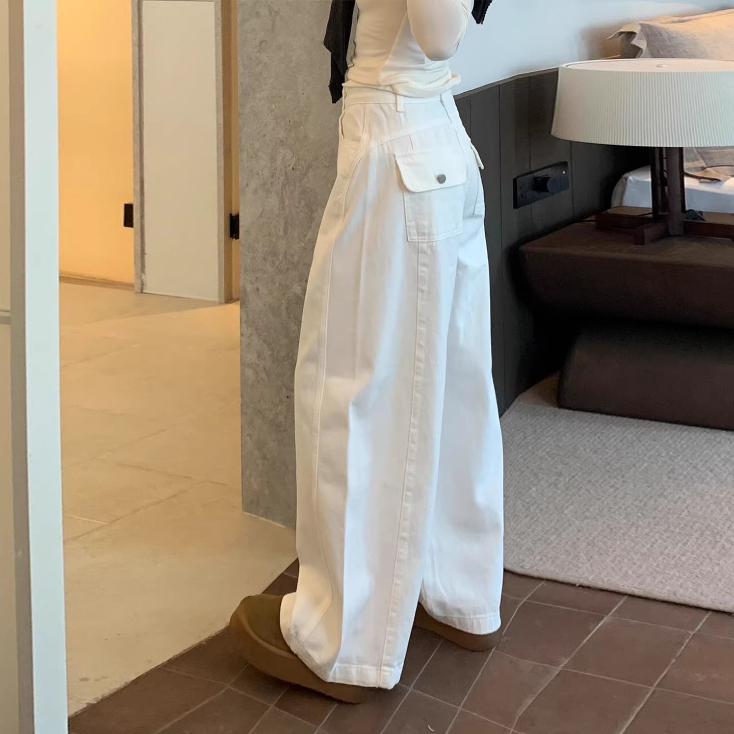 白いワークデニムパンツレディース小柄さん向けワイドレッグバンデージパンツ夏セクシー高めウエスト着やせファッション性高いチェニックな韓国風パンツ