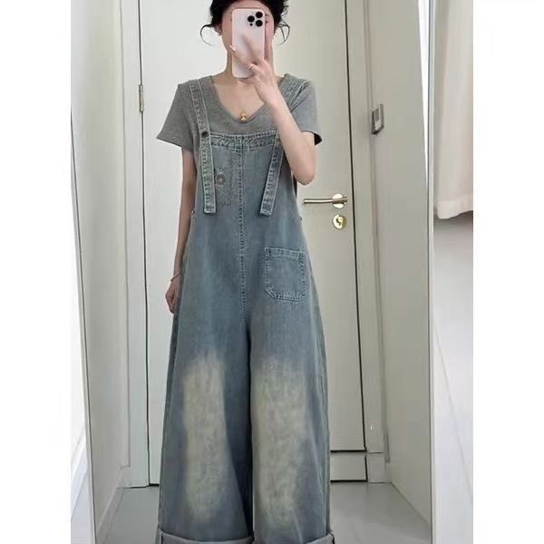 夏新作韓国風グレーブラックVネックTシャツトップスヴィンテージブルーデニムサロペットスカート女性トレンド服