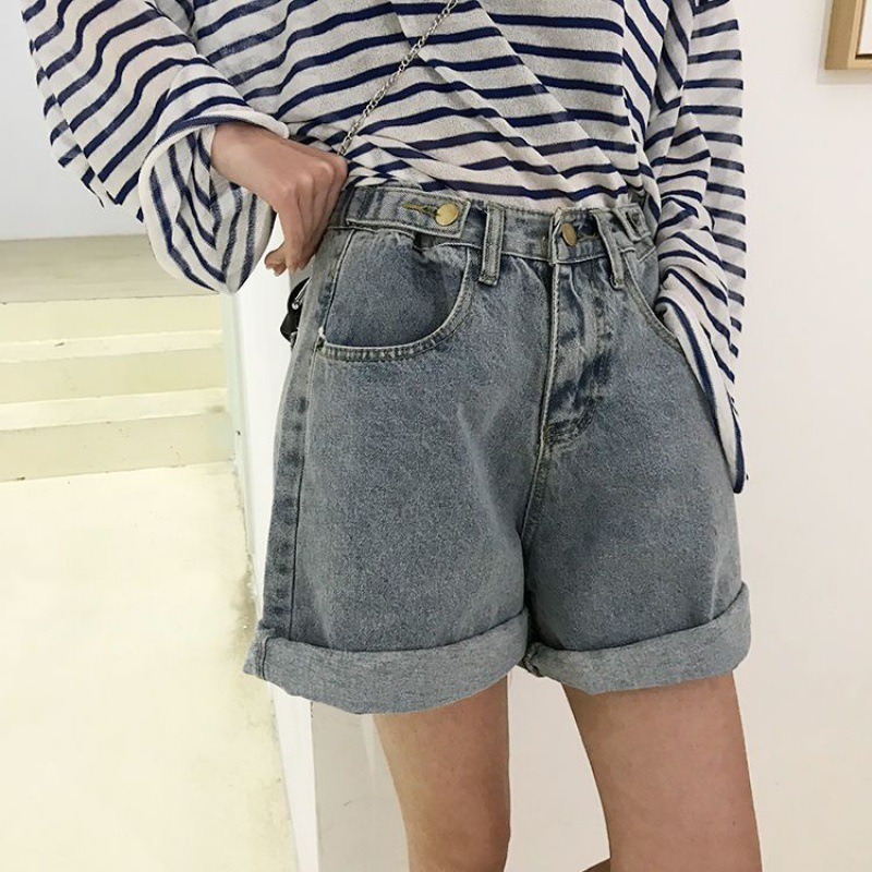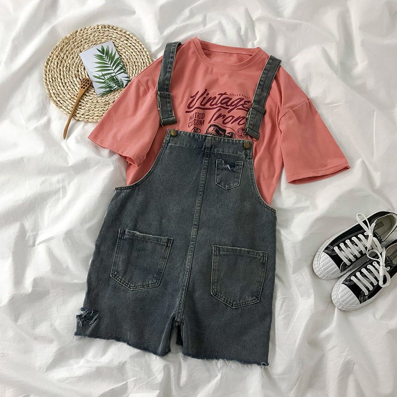 夏新作韓国風デニム女子学生ハイウエスト着やせゆったりサスペンダー付きパンツホール入り若見え太めの裾