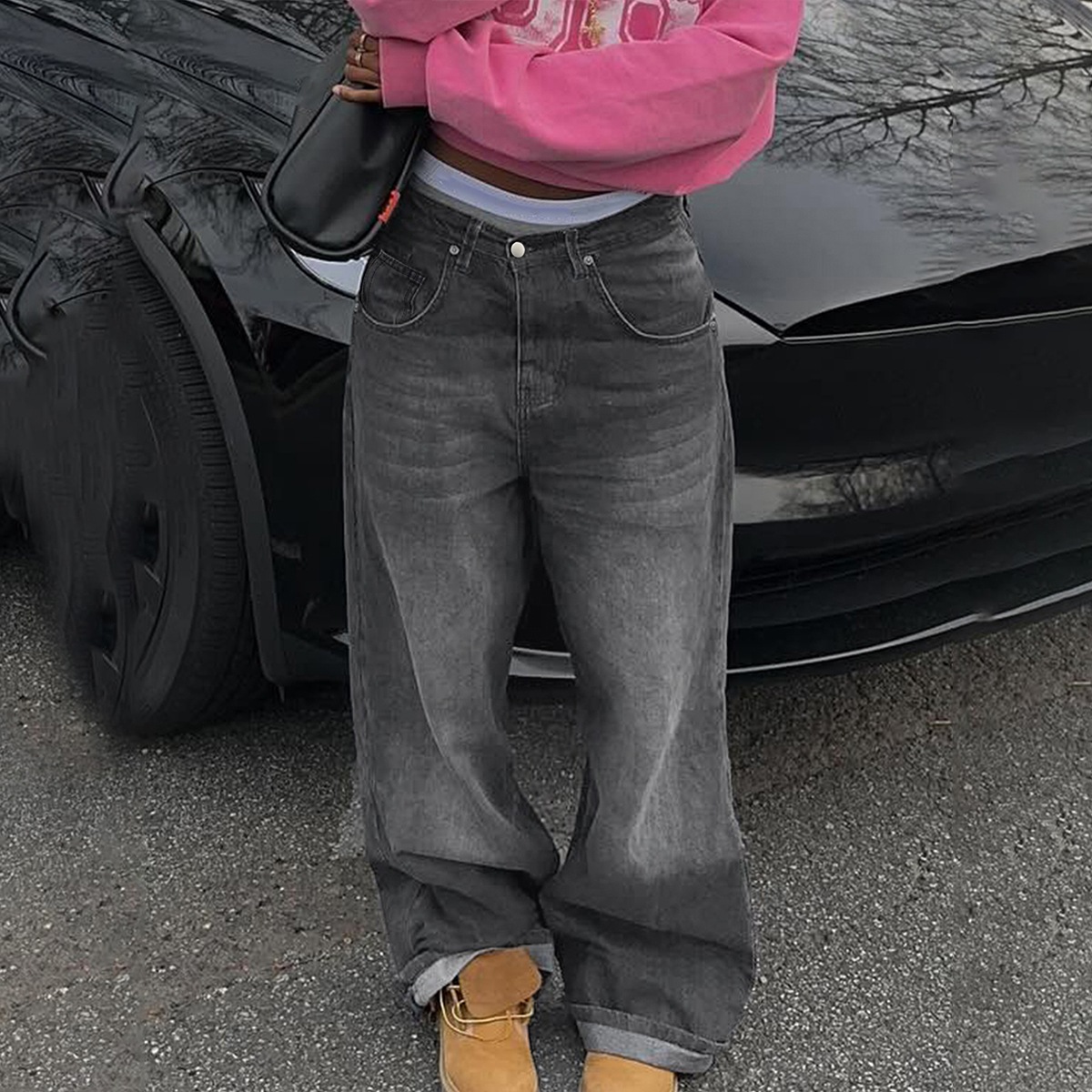 夏物レトロウォッシュデニムパンツ韓国風新作ハイウエスト万能太めのワイドクロップドパンツロングパンツ女性用