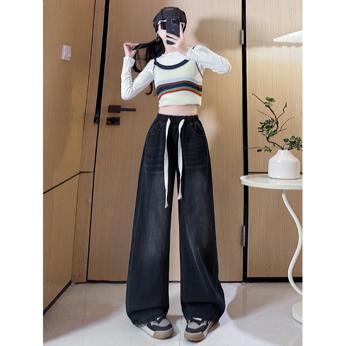 ゴム入りウエストデニムパンツ女性夏新作Instagram韓国風おしゃれハイウエストゆったり体型カバー着やせ太めのワイドレッグパンツ