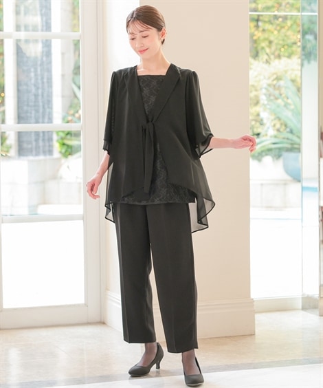| 材料/素材 | 品質=ブラウス【表地】本体:ポリエステル100%(織物)別布:ポリエステル100%(編物)パンツ:ポリエステル100%(織物) [裏地]有(ブラウス:身頃部 パンツ:無) ブラウス:前ファスナー開 パンツ:前ファスナー内ホック開 ウエスト後ゴム入 ポケット両脇 ※この商品は2点同サイズのみで販売します。 ※柄の出方が異なる場合があります。 ※繊細な生地を使用しているため、引っかかりなどにご注意ください。 | ||