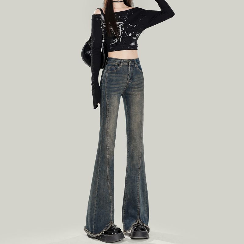 シルエットが綺麗な微ラウンドジーンズレディースストレートデニムタイツ高めのウエストラッパ型の微ラウンドパンツレディース低身長さん向けパンツストレートレディース