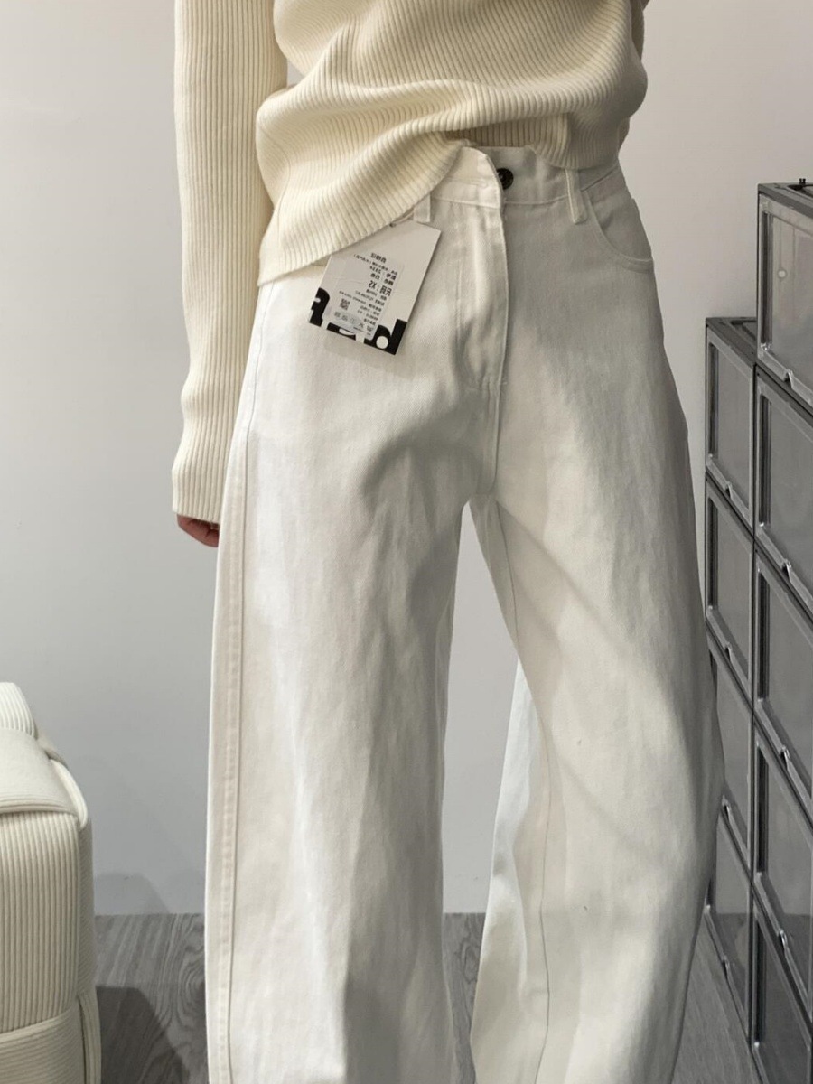 ワイドシルエットのゆったりストレート白デニムパンツレディース夏春タイプライズハイウエストほっそり見えストレートパンツレディース着やせレディース用