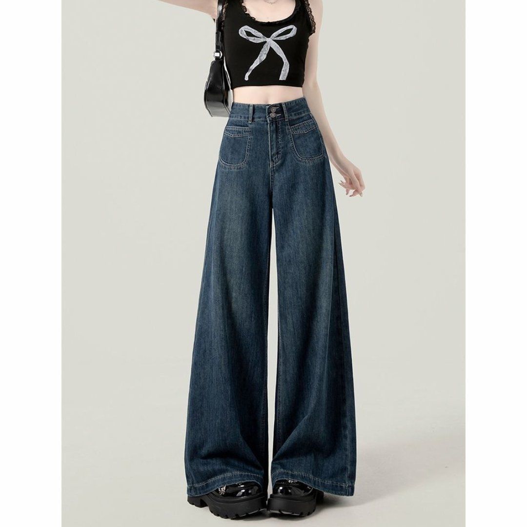 ブルーハイウエスト太めのワイドレッグデニムパンツ女性用夏りんご体型着やせしなやかな落ち感夏ゆったり直筒ロング丈パンツ