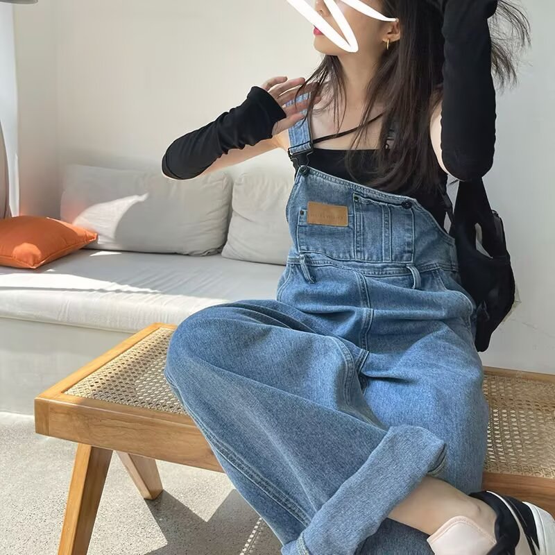 デニムサロペット夏女性着やせ目立つ夏物年齢より若く見えるゆったりアメリカンヴィンテージ太めのワイドレッグトレンチ丈ロングパンツ