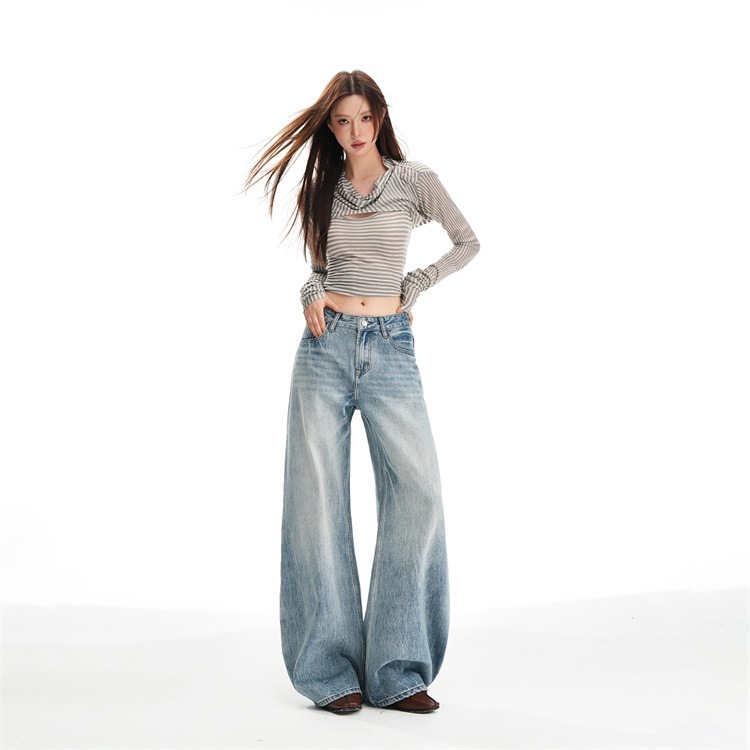 明るい色のワイドレッグデニムパンツ女性秋冬トレンド新作水洗い加工ハイウエストゆったりはく脚やせ効果ダボっとしたストレートシルエットリーンテーパードレディース