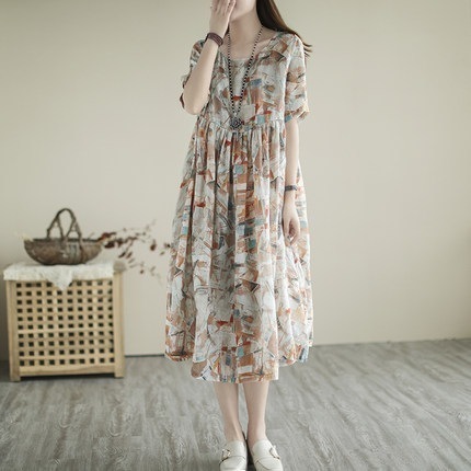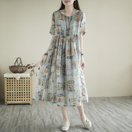 【急速出荷】 即納花柄ゆったりしたa字スカート大きいスカートリゾート風綿麻中で長いワンピース