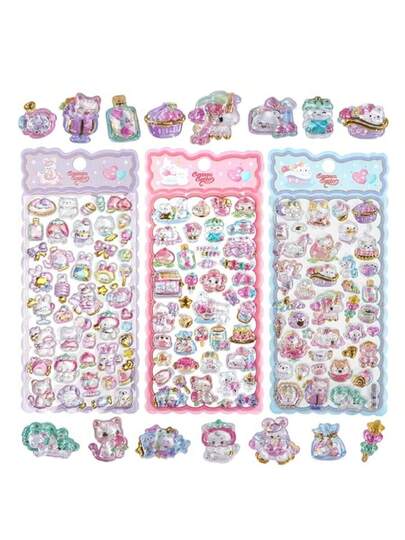 かわいい小さなステッカー - 愛らしい猫動物ファンタジーテーマのふわふわ透明ステッカー - グリッターとゴールドのアクセントがありスクラップブッキングスマホケースの装飾に (ランダムカラー発送