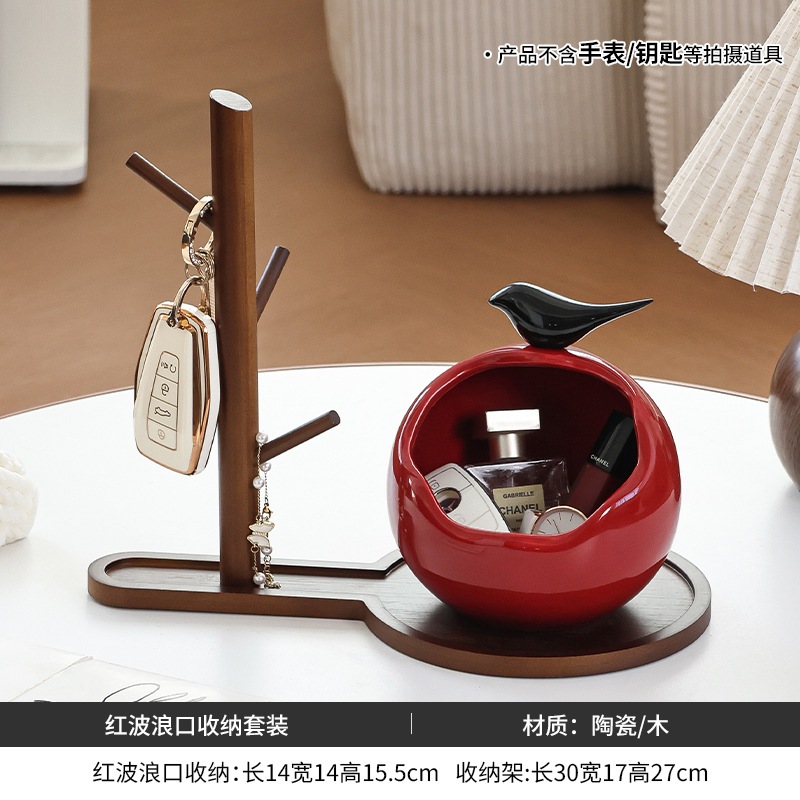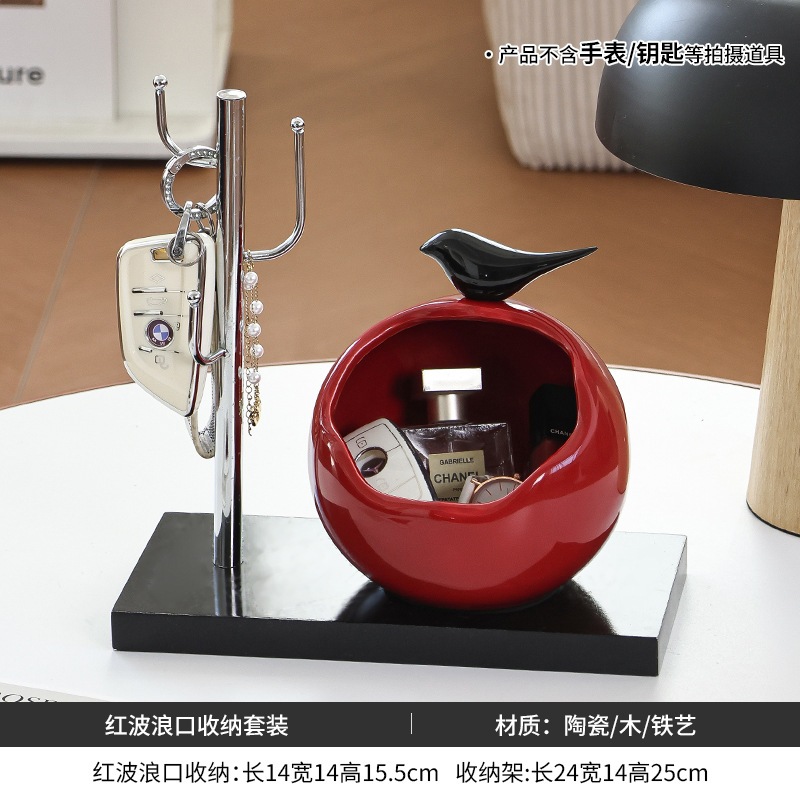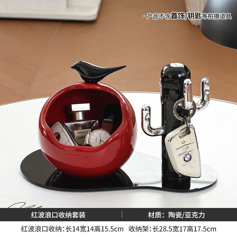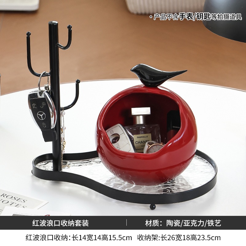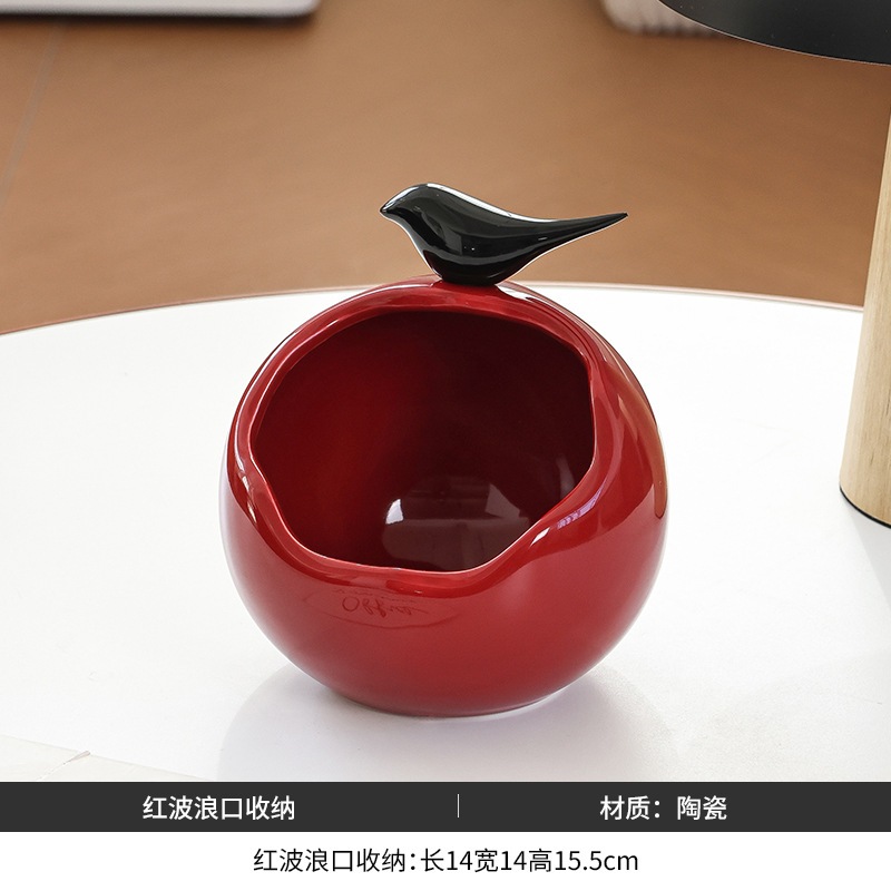 新生活 母の日プレゼント 贈り物 和風 置物 収納 赤い波型の収納ボックス黒い鳥の装飾が施されたデスクトップリビングルーム玄関の鍵や小物収納ボックス