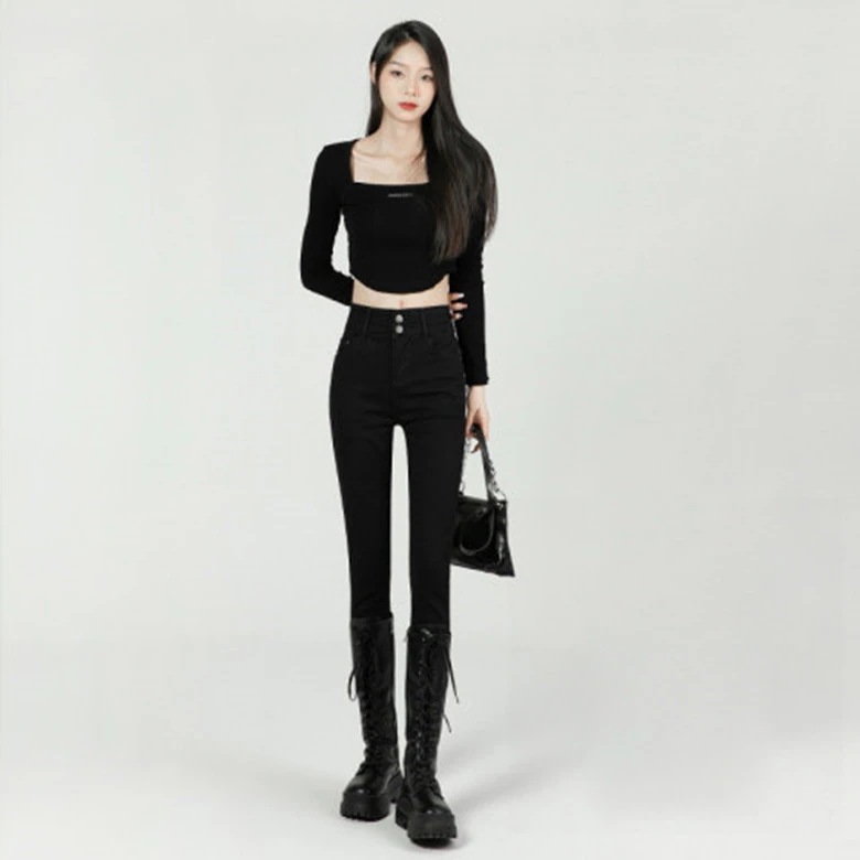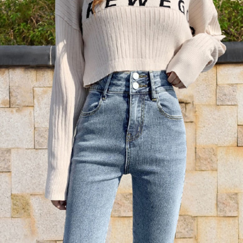 ハイウエスト ボタン ジーンズ 女性 春夏 スリム ヒップアップ タイト ストレッチ ペンシル 小さい足 レディースパンツ