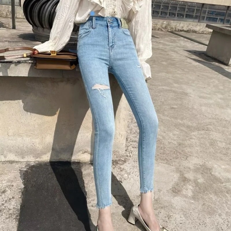 着古した ジーンズ 女性 ハイウエスト ストレッチ 薄い どうやら高い 小柄 九点 鉛筆 小さい足 夏 白を着る 使い古された