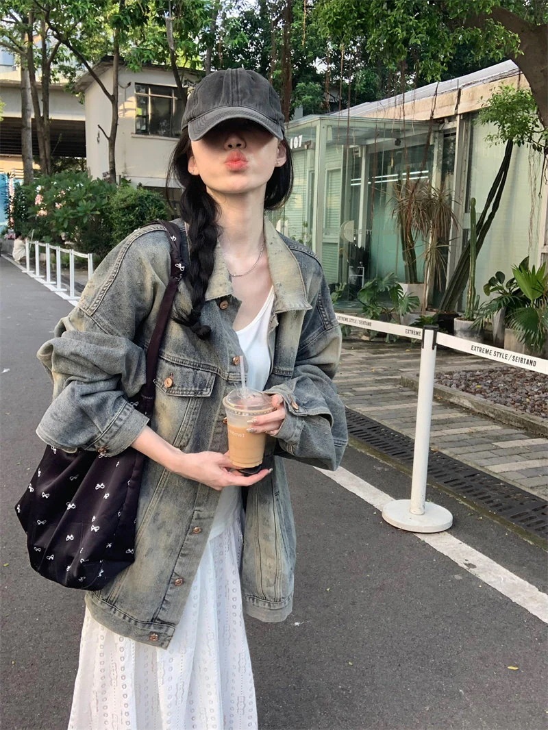 体をすっぽり包み込むルーズな抜け感 デニムジャケット Gジャン レディース 春 アウター ポロ襟 チュニック丈 ビッグシルエット オーバーサイズ ゆったりヴィンテージウォッシュレトロ体型カバー