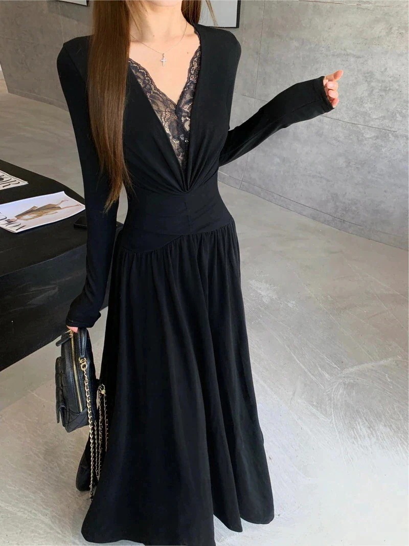 ラインワンピ パーティードレス ワンピース セクシーレースパッチワークVネック長袖ワンピース女性秋新作ウエストスリムAラインロングドレス