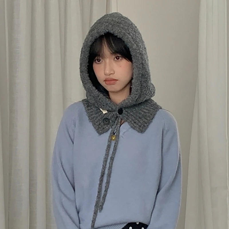 バラクラバ風ニット帽 ブルー 女性用 秋冬 帽子マフラー一体型 ウール 保温 耳あて