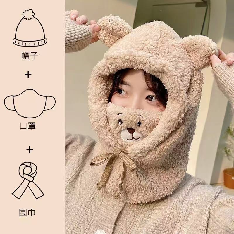 可愛い 小熊 マフラー 帽子 保温 一体型 帽 学生 子羊 もこもこ レディース 帽 マスク ふわふわ 帽子