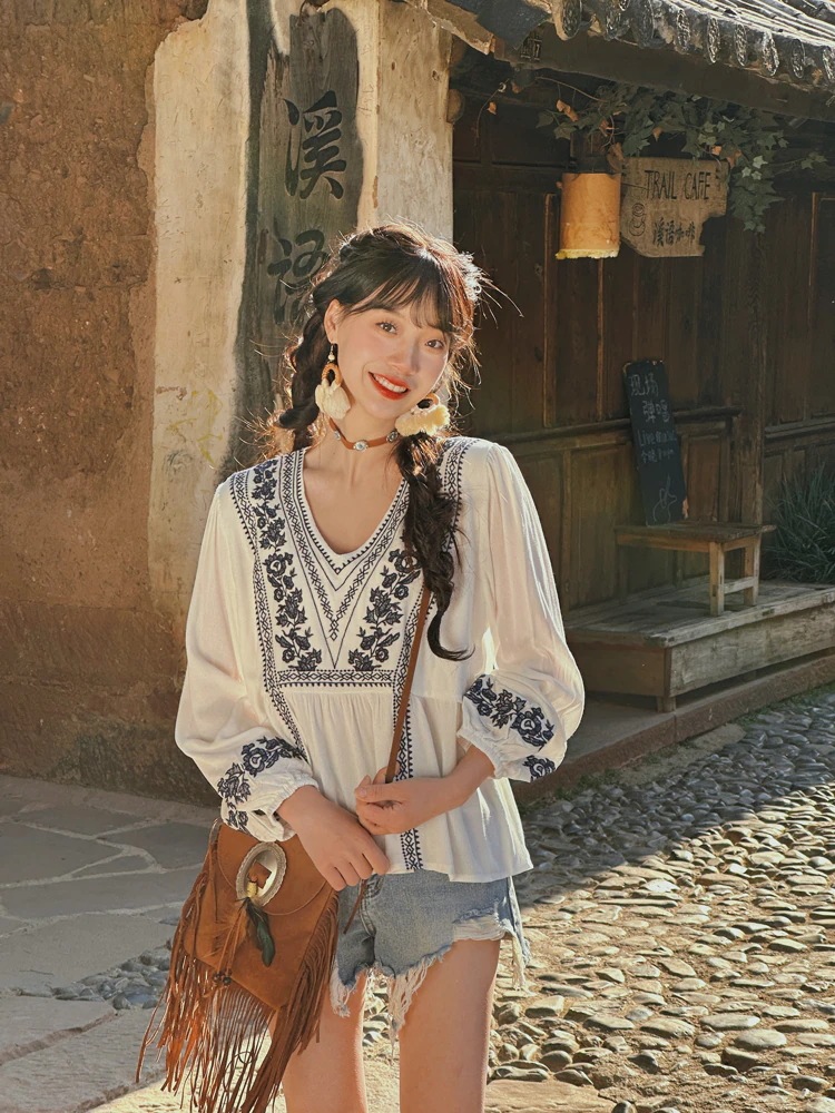 夏のゆったりとしたエスニック刺繍の白い綿麻のドーターカジュアルなトップス レディース シャツ ブラウス