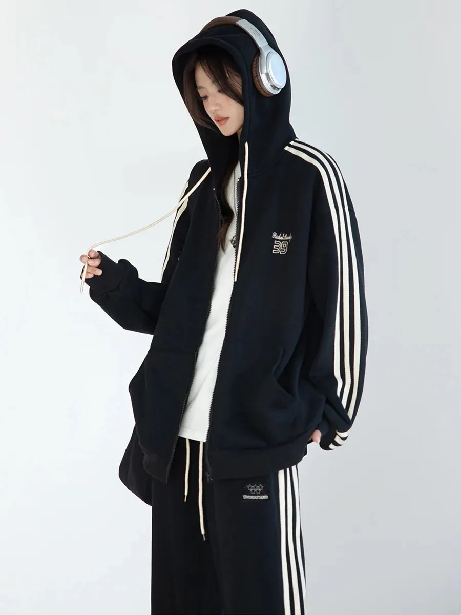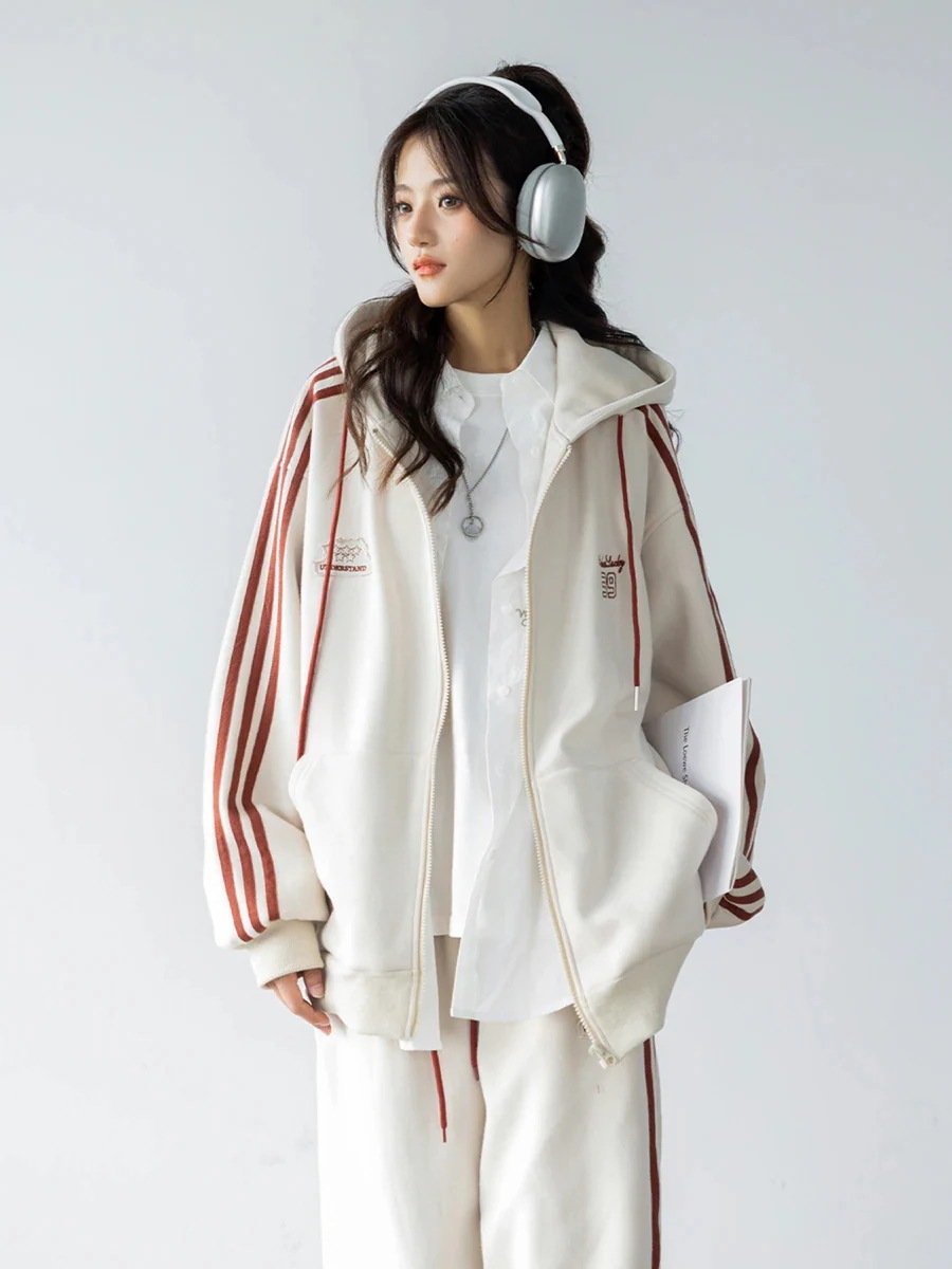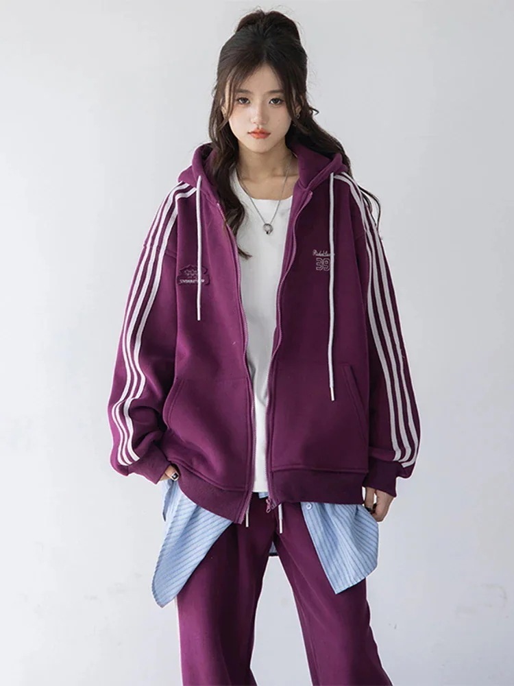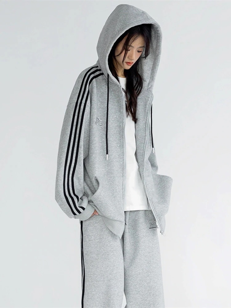 25 2点セット 韓国っぽフード付きかわいいレディーススポーティーパーカー長袖アウター羽織りショート丈ブルサイズ丈カジュアルスポーツファッション系サイドアップリラックスシルエット上下トラック