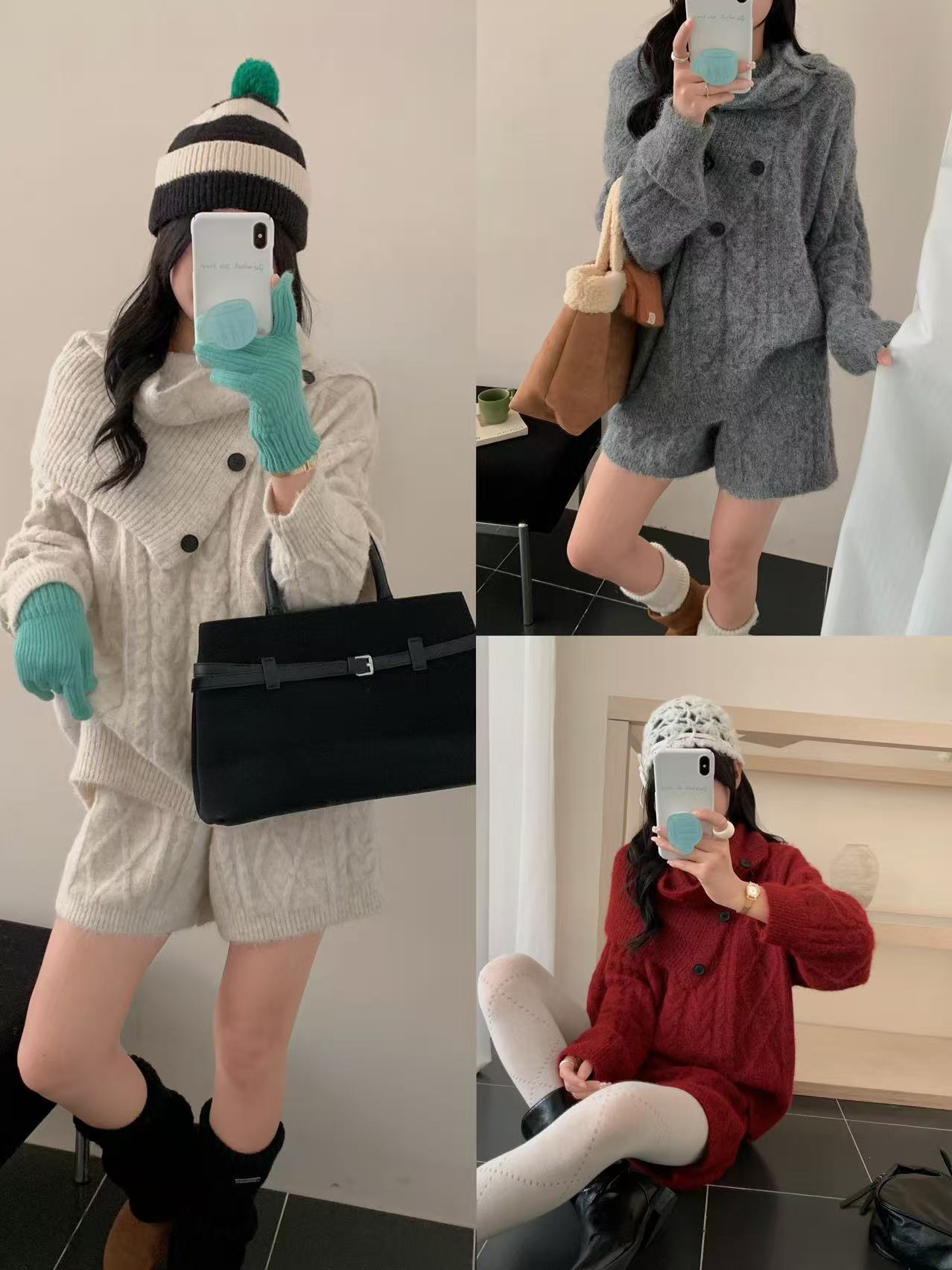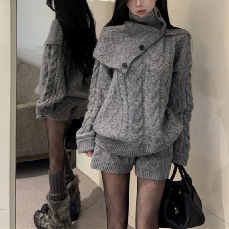 25レトロ編み込みセーター+ショートパンツ ストール付き カジュアル3点セット 上品な着こなし ゆったりセットアップ