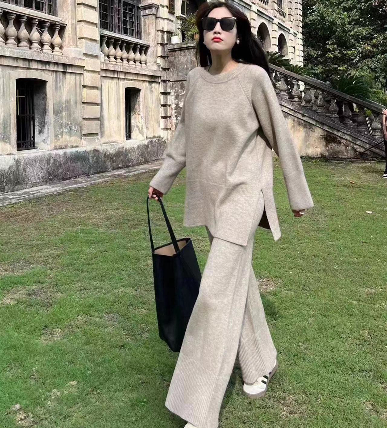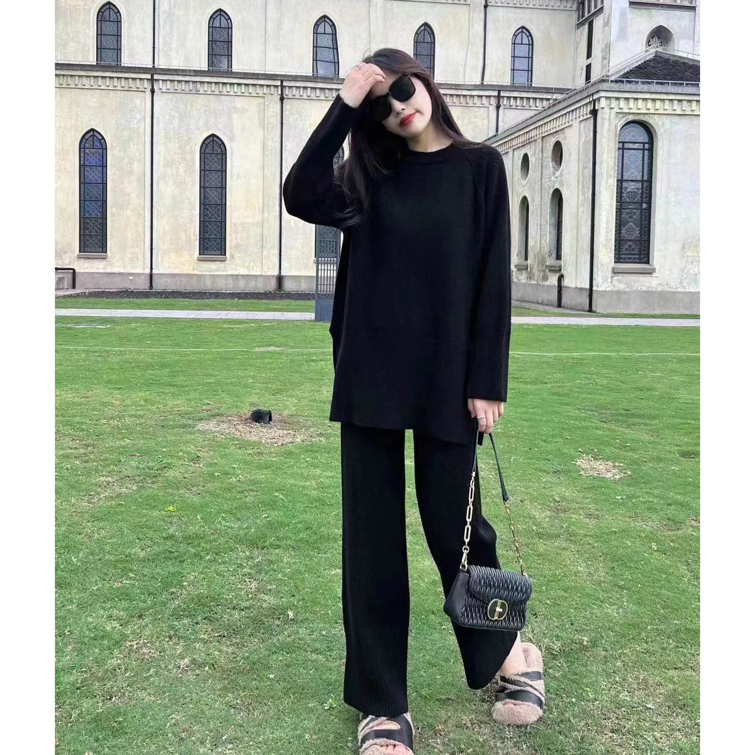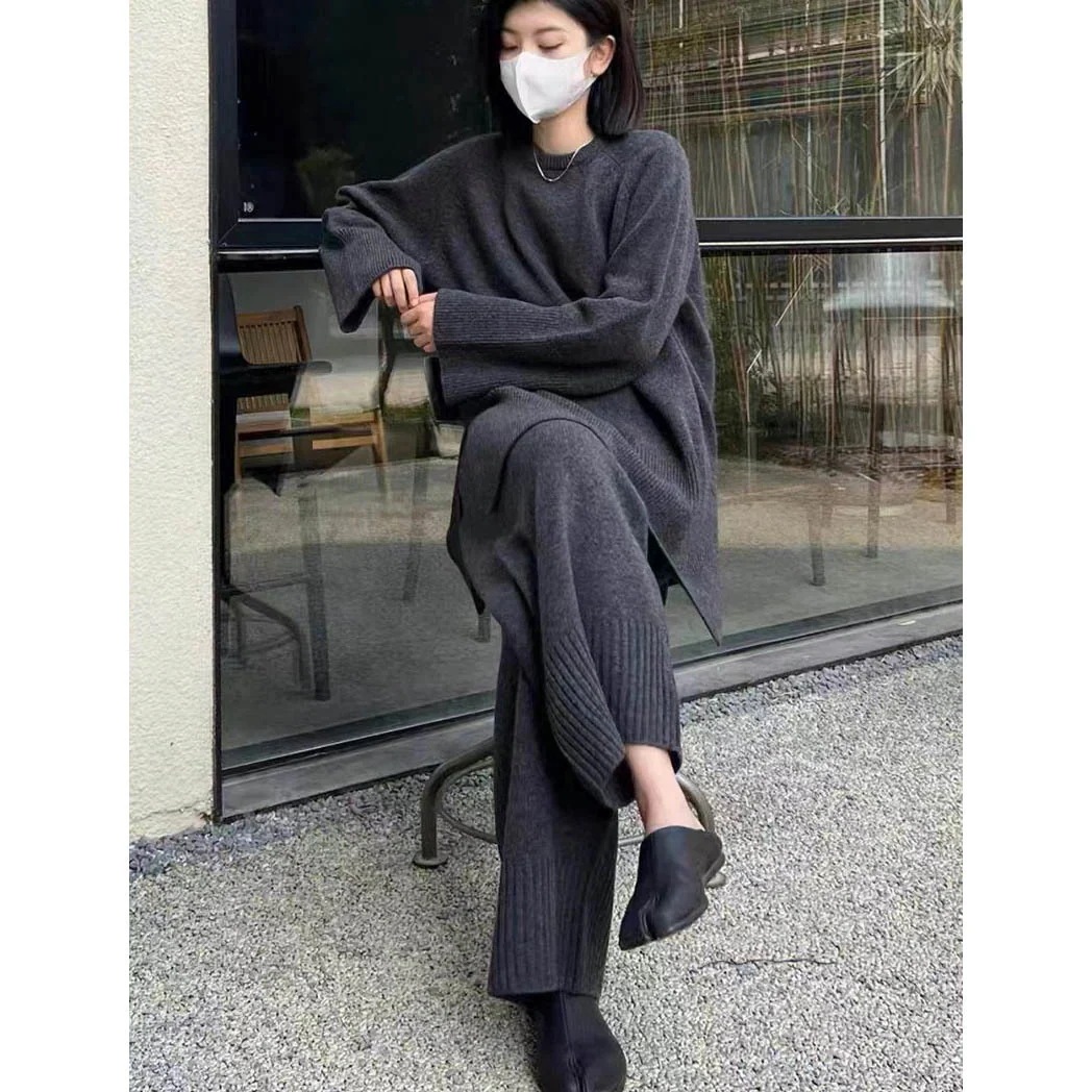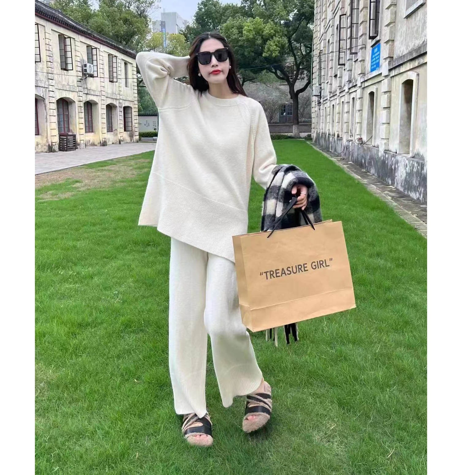 ゆったりおしゃれカジュアルニットセット レディース 韓国風 ゆったり 新作セーター+ワイドパンツ2点セット
