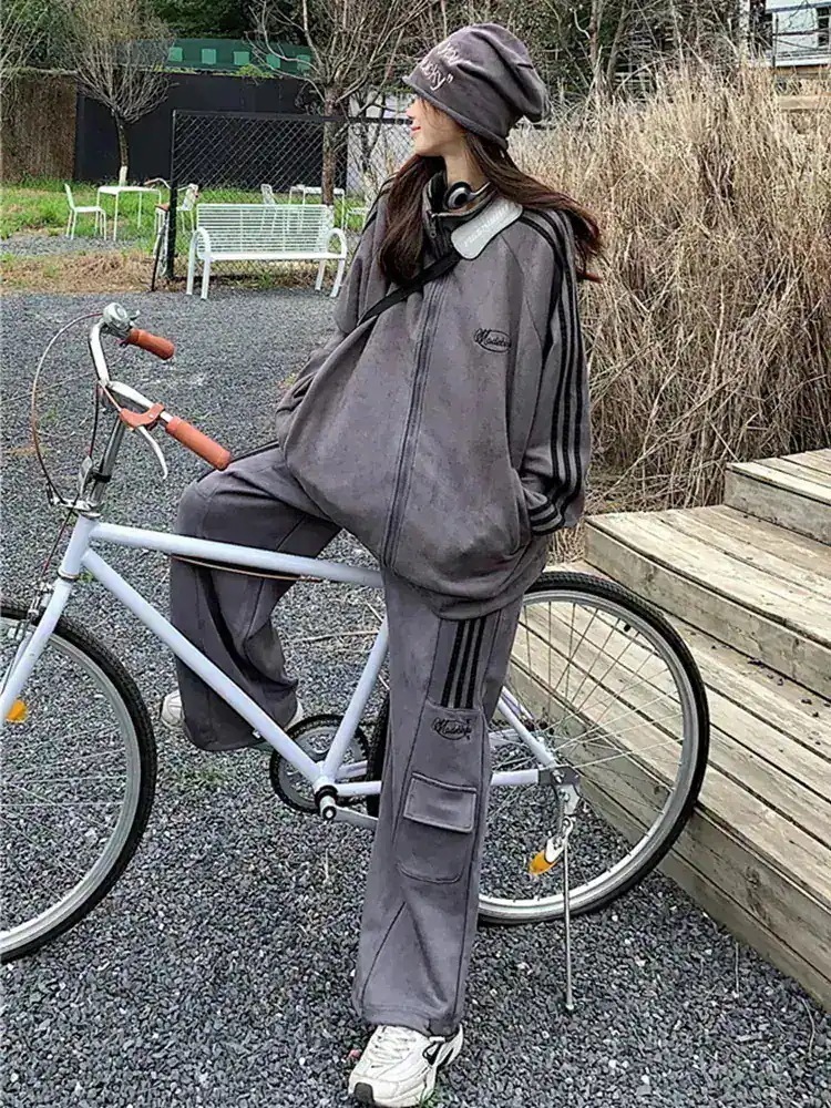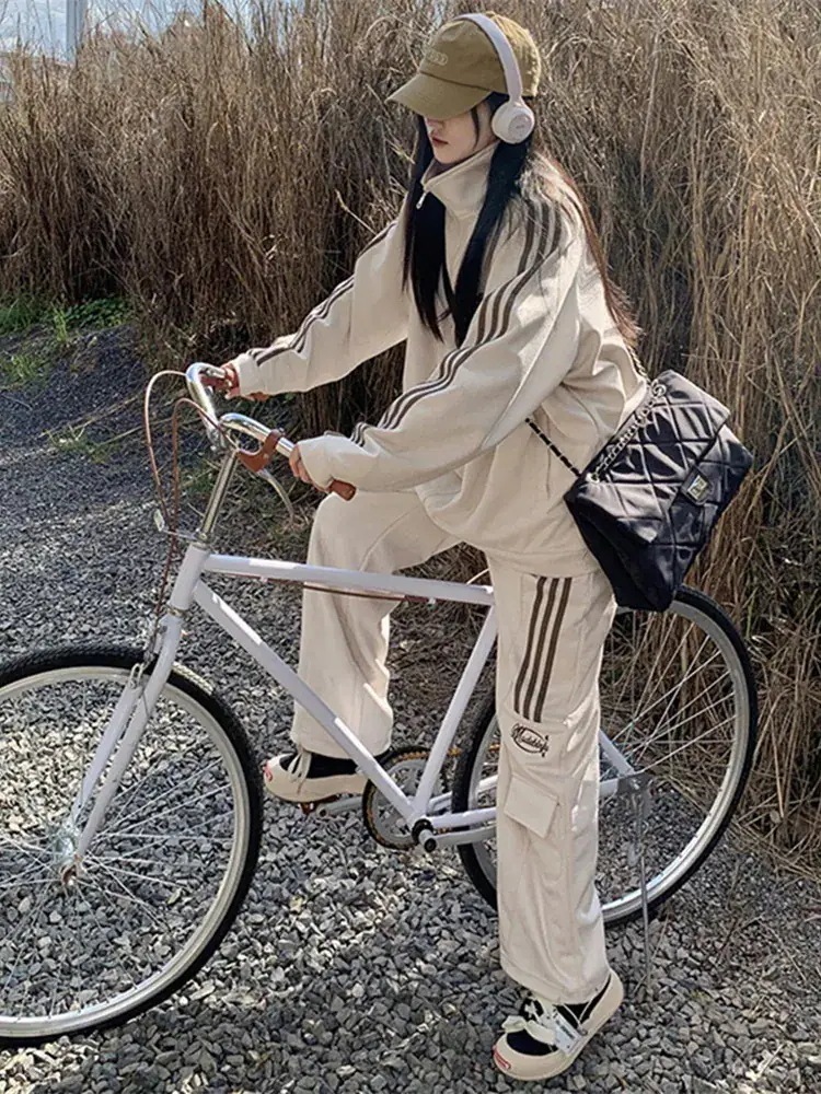 25 2点セット トップス ック スタンドネック 羽織り ショート丈 フルパーカー ルーズ サイド上下ボトムス ストレート系 ゆったりサイズワイドシルエットリラックストラック