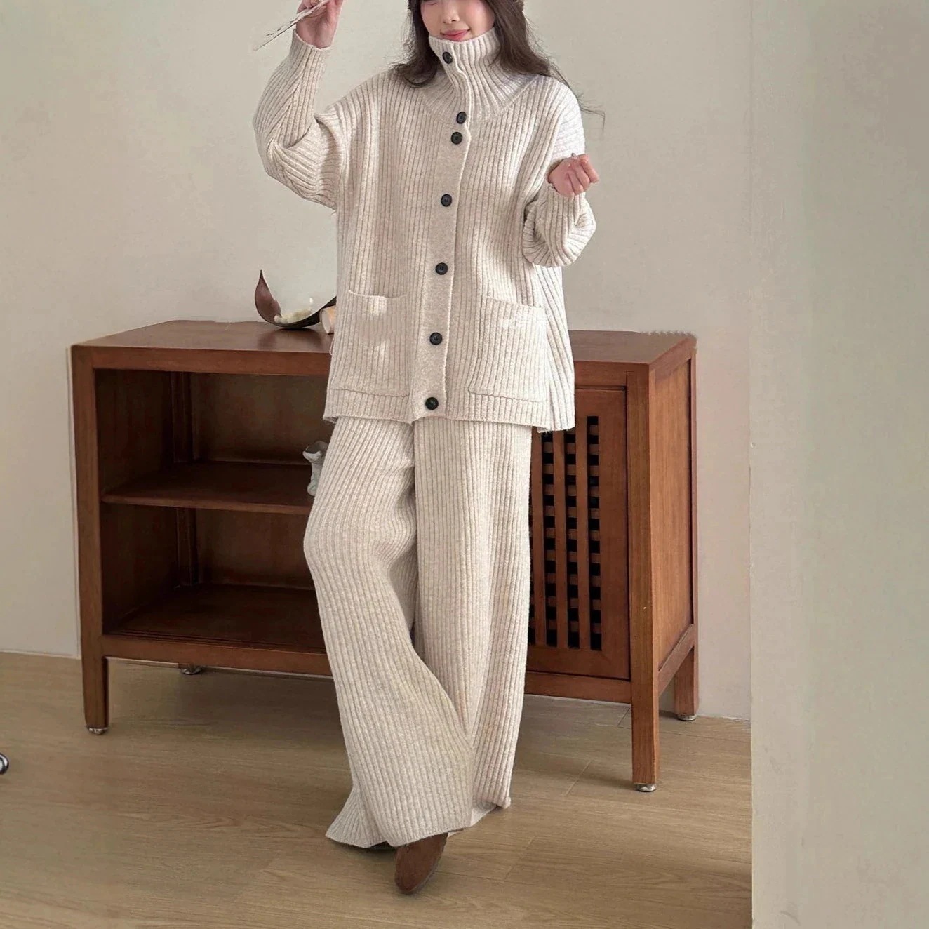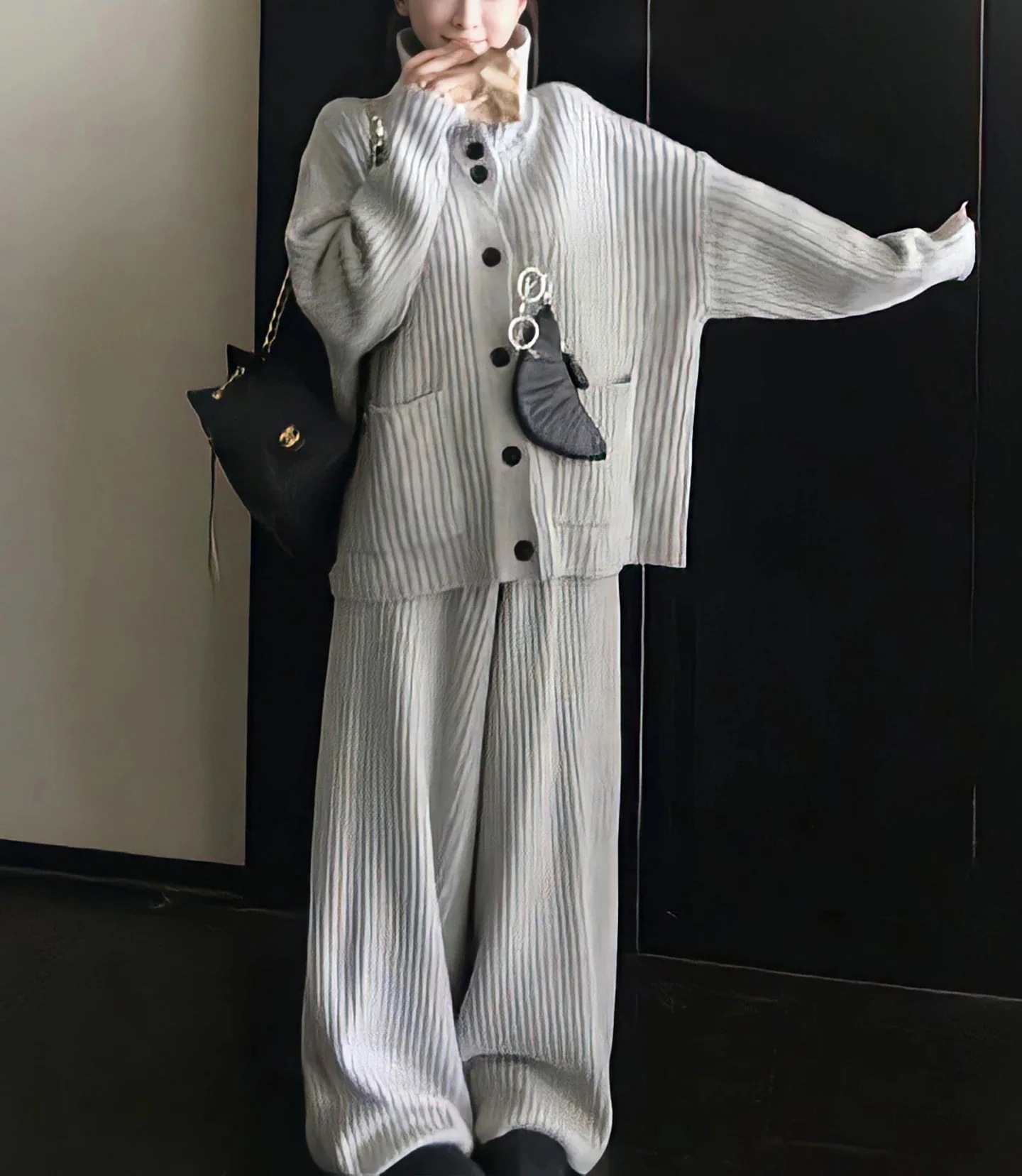韓国風 カジュアルニットセット 婦人用 新作 厚手 ックカーディガン+ルーズワイドパンツ 2点セット